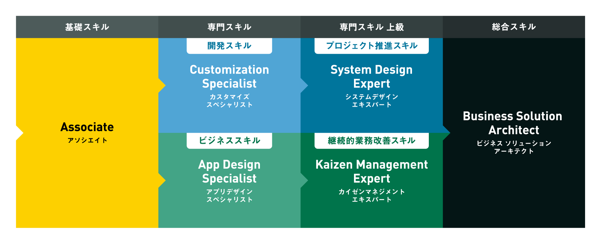 kintone認定資格では、kintone に関する基礎知識と各分野の専門スキルをサイボウズが公式に認定します。日頃 kintone を便利に使っているユーザーから、kintone で業務改善をしているエンジニア、そして kintone の活用をさらに広くさらに深く進めたい管理者まで、kintone スキルの成熟度に合わせて 4 レベル・6 種類の資格で構成されます。
