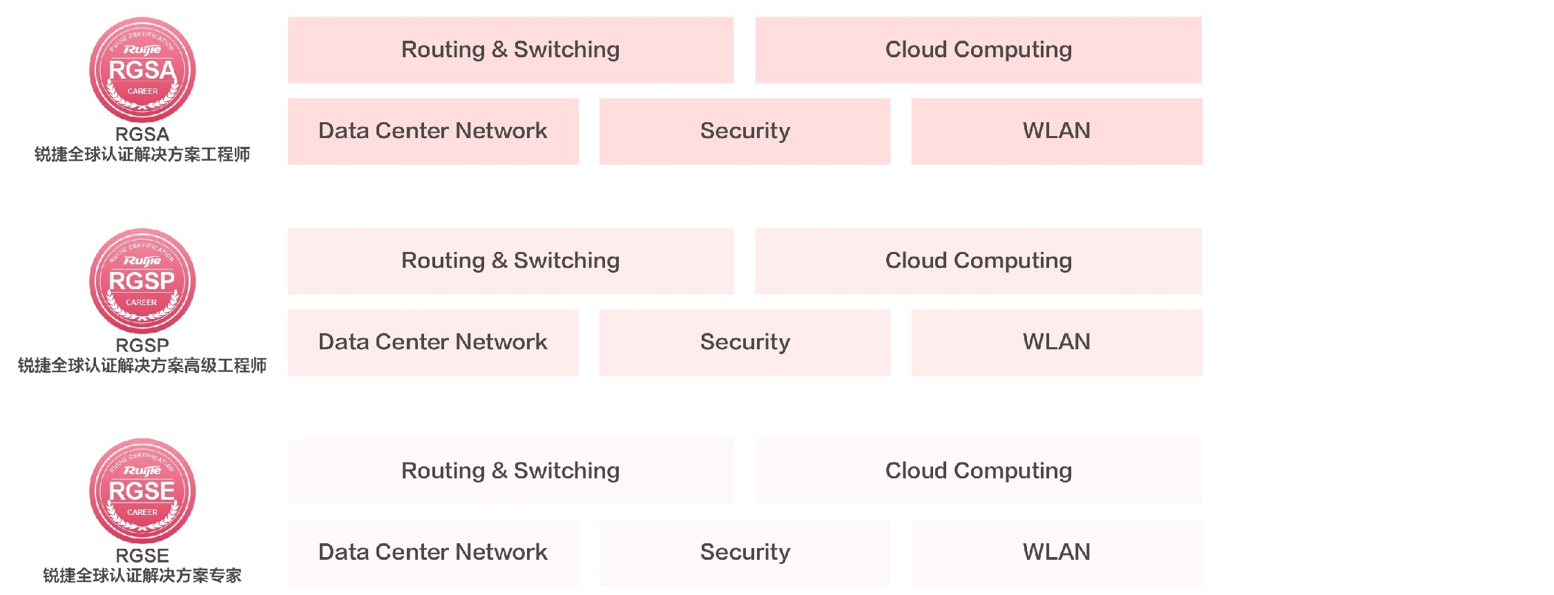 锐捷认证是锐捷以产品、技术与资源为平台,结合自身多年 ICT 基础设施建设及行业解决方案开发经验,开发出的一套 ICT 人才培养标准,是锐捷为培养 ICT 领域人才打造的认证。 根据 ICT 领域的学习和进阶需求,锐捷职业认证分为工程师级别、高级工程师级别和专家级别三个认证等级,涵盖路由交换、 云计算、数据中心、安全等多个方向。