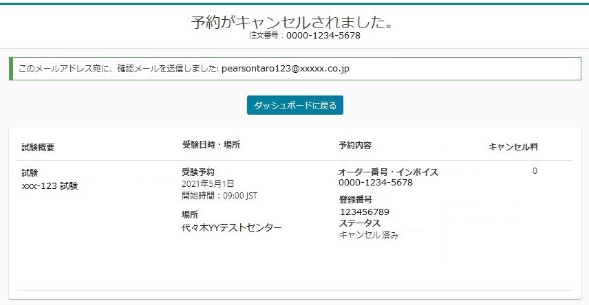 ⑩で「予約内容の確定」をクリックすると、次のページに予約内容が表示されます。同時に登録先の Eメールアドレスに試験予約の内容が記載されたEメールが送信されます。